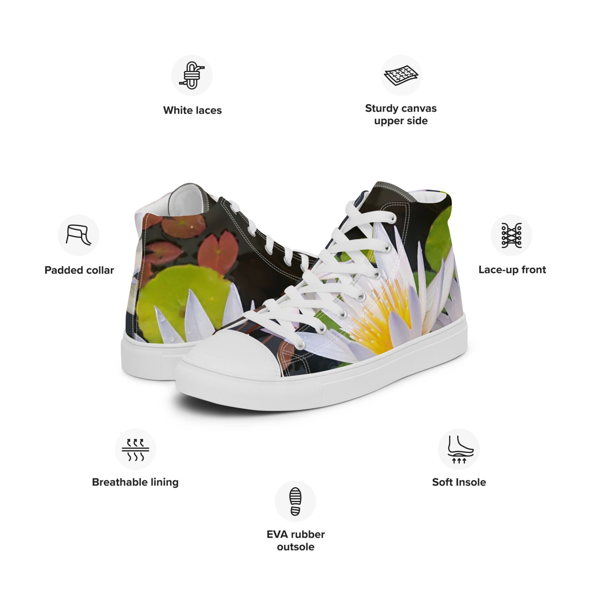 Shoes are what makes a look stand out—whether they match the outfit or not. The handmade High Top Canvas Shoes have a retro feel to them, and can add the final touch to various clothing styles. In design creation is used real water lillies photo. Photo was taken in Rotterdam, Netherland. All copyrights of design reserved by Elfie's world.