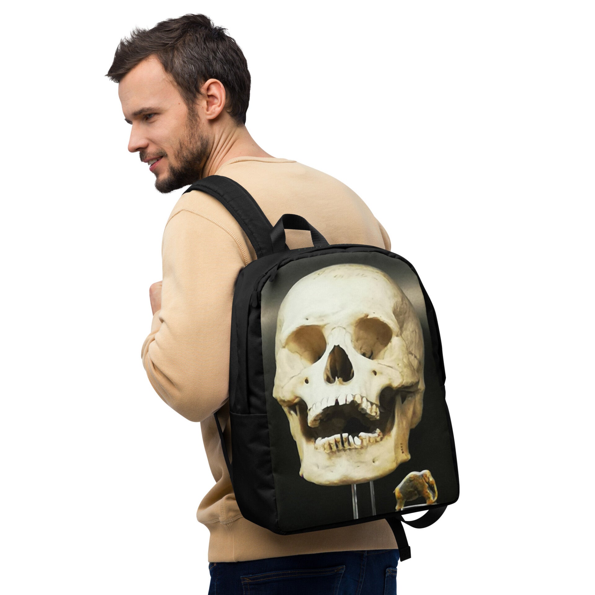 Here’s a spacious backpack for people on the go! Minimalist Backpack is made from a water-resistant material. It has a large inside pocket for a laptop and a hidden pocket that's perfect for keeping valuable items safe and accessible while traveling. In design creation is used human skull photo. Photo was taken in Frankfurt, Germany. All copyrights of design reserved by Elfie's world.