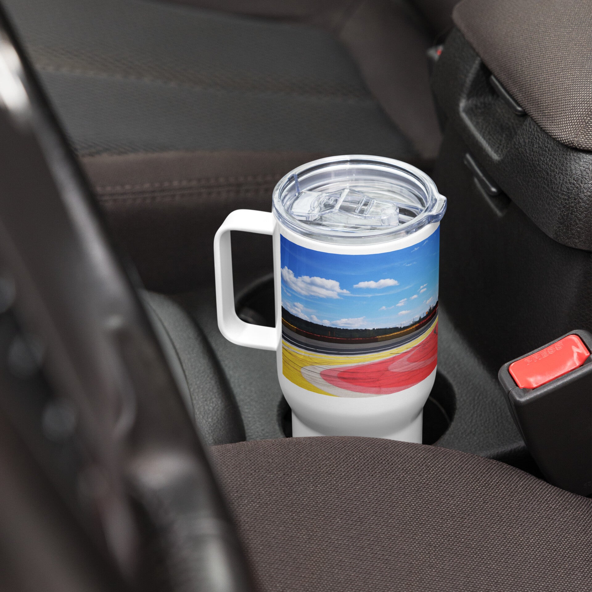 Enjoy your favorite beverage on the go with a premium-quality travel mug. It’s made with stainless steel and keeps hot drinks hot for up to 6 h, and cold drinks cold for up to 8 h. It fits into most car cup holders and has a spill-proof plastic lid. In design creation is used real Francorchamps circuit photo. Photo was taken in Stavelot, Belgium. All copyrights of design reserved by Elfie's world.