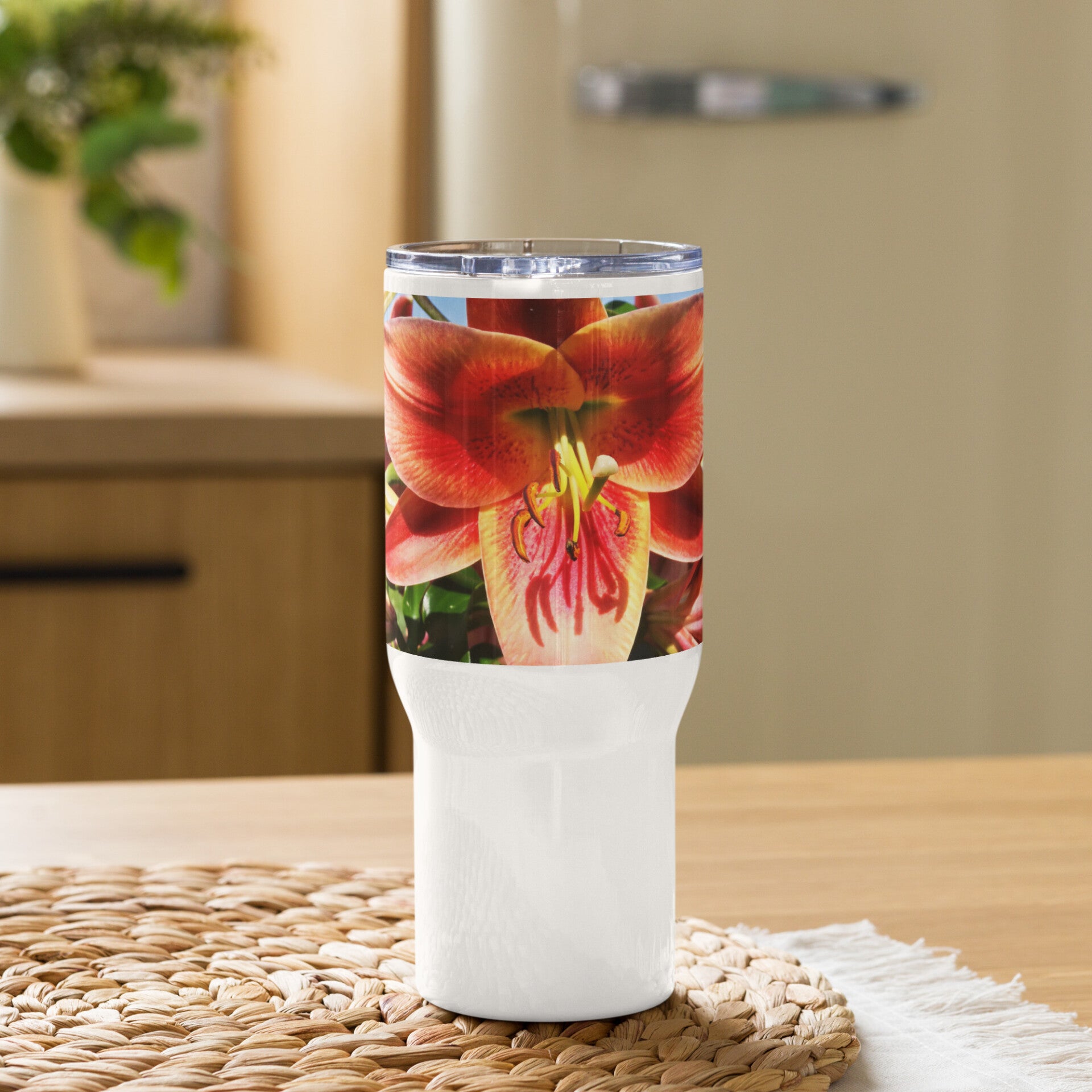 Travel mug with handle and orange lilies