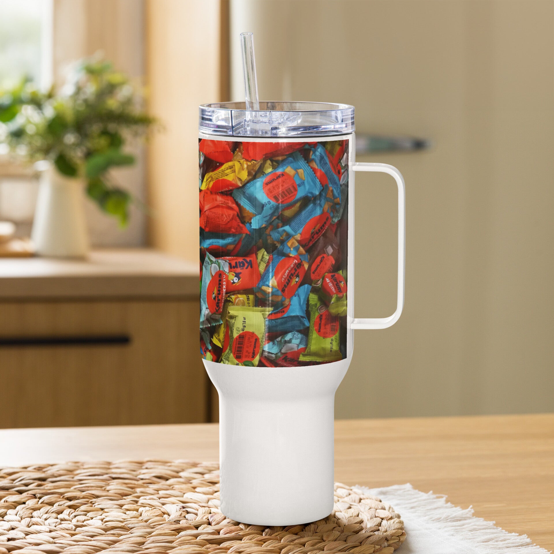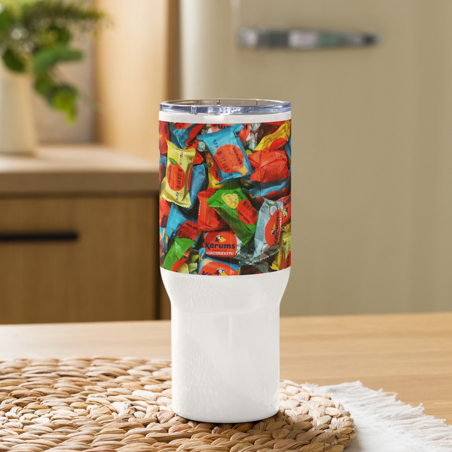 Enjoy your favorite beverage on the go with a premium-quality travel mug. It’s made with stainless steel and keeps hot drinks hot for up to 6 h, and cold drinks cold for up to 8 h. It fits into most car cup holders and has a spill-proof plastic lid. In design creation is used real curd snack "Karums" photo. Photo was taken in Latvia. All copyrights of design reserved by Elfie's world.
